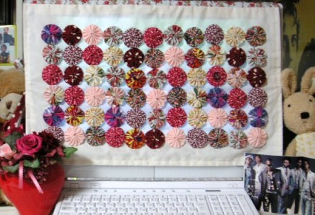 ポリスパソコンカバー ![]() お花の一つがゼニヤッタ・モンダッタ ![]() パソコン修理に出したら新型のパソコンが返ってきました。お陰で前のカバーが合わなくなったので、古いブラウスとか、 ワンピースとか、ばあちゃんのあっぱっぱーなどでパッチワーク。本当は5枚のアルバム全てを埋め込みたかったけれど、 面倒だからゼニヤッタ1枚。(2008年10月) |